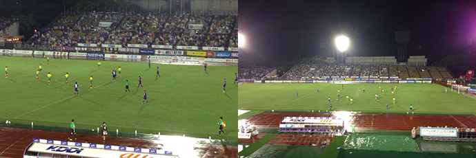試合開始の午後7時には、なんとか小雨にはなりましたが、止むことはなく、カッパを着ての応援でした。